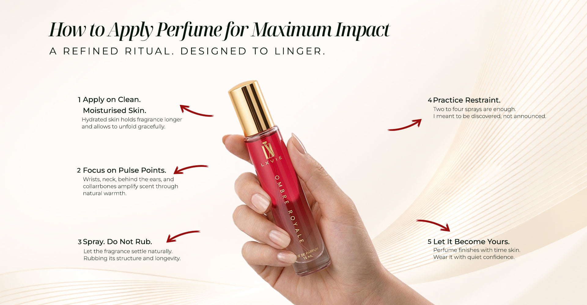 Spray on pulse points: wrists, neck, and behind ears for lasting effect